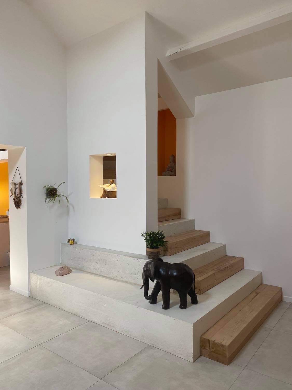 Montée d'escalier avec poutre chêne vue de face